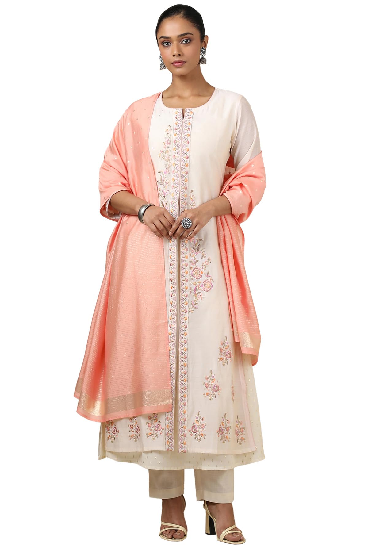 Brand: Soch Color: Cream Features: Pattern: Embroidered Style Type: Straight Top Fabric: Silk Blend||Bottom Fabric: Silk Blend||Dupatta Fabric: Chanderi Package Contains: 1 Kurta, 1 Pant, 1 Dupatta Package Dimensions: 30x300x300 Details: Description Soch Womens Cream Silk Blend Embroidered Suit Set With Thread Work
