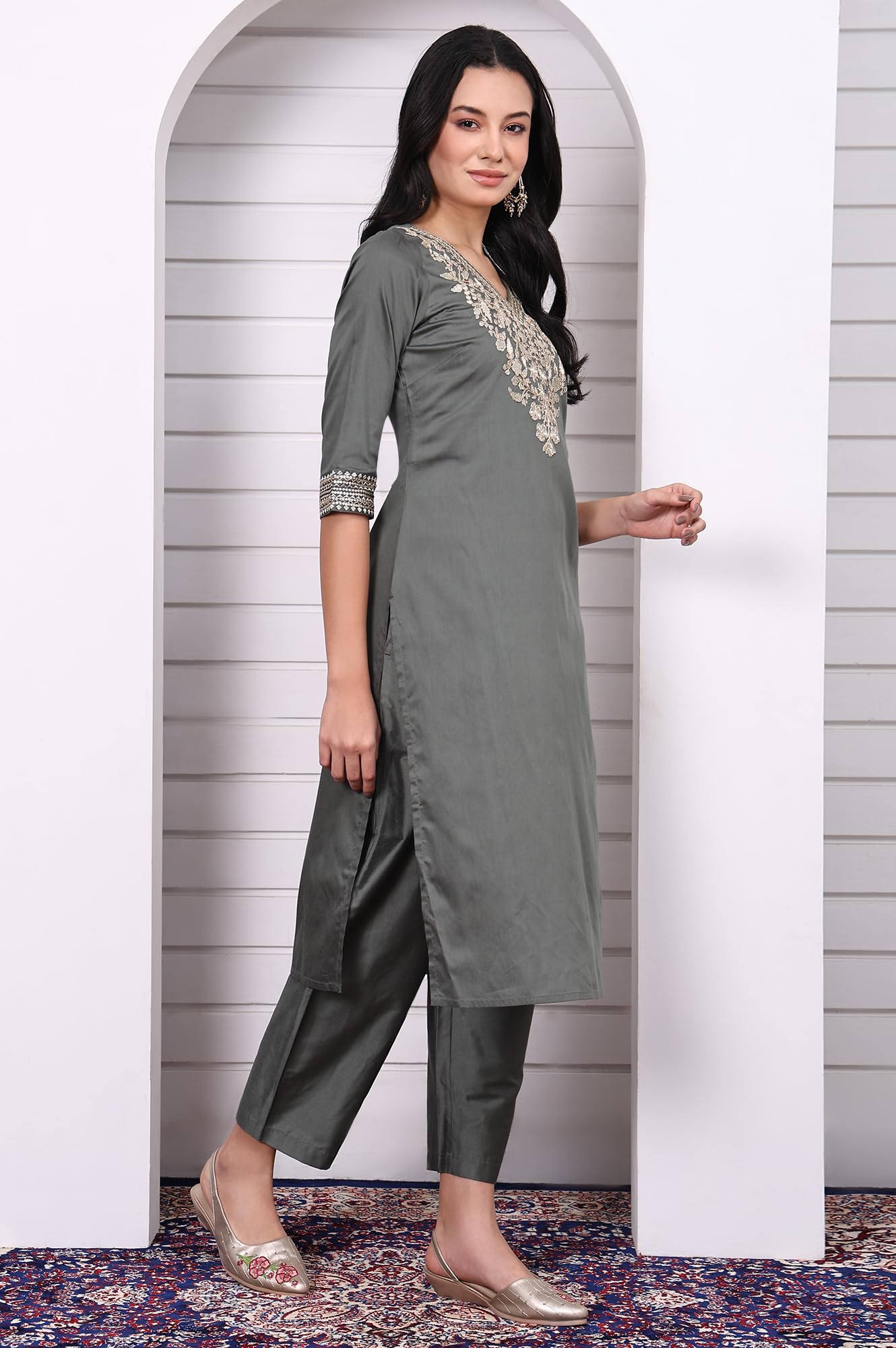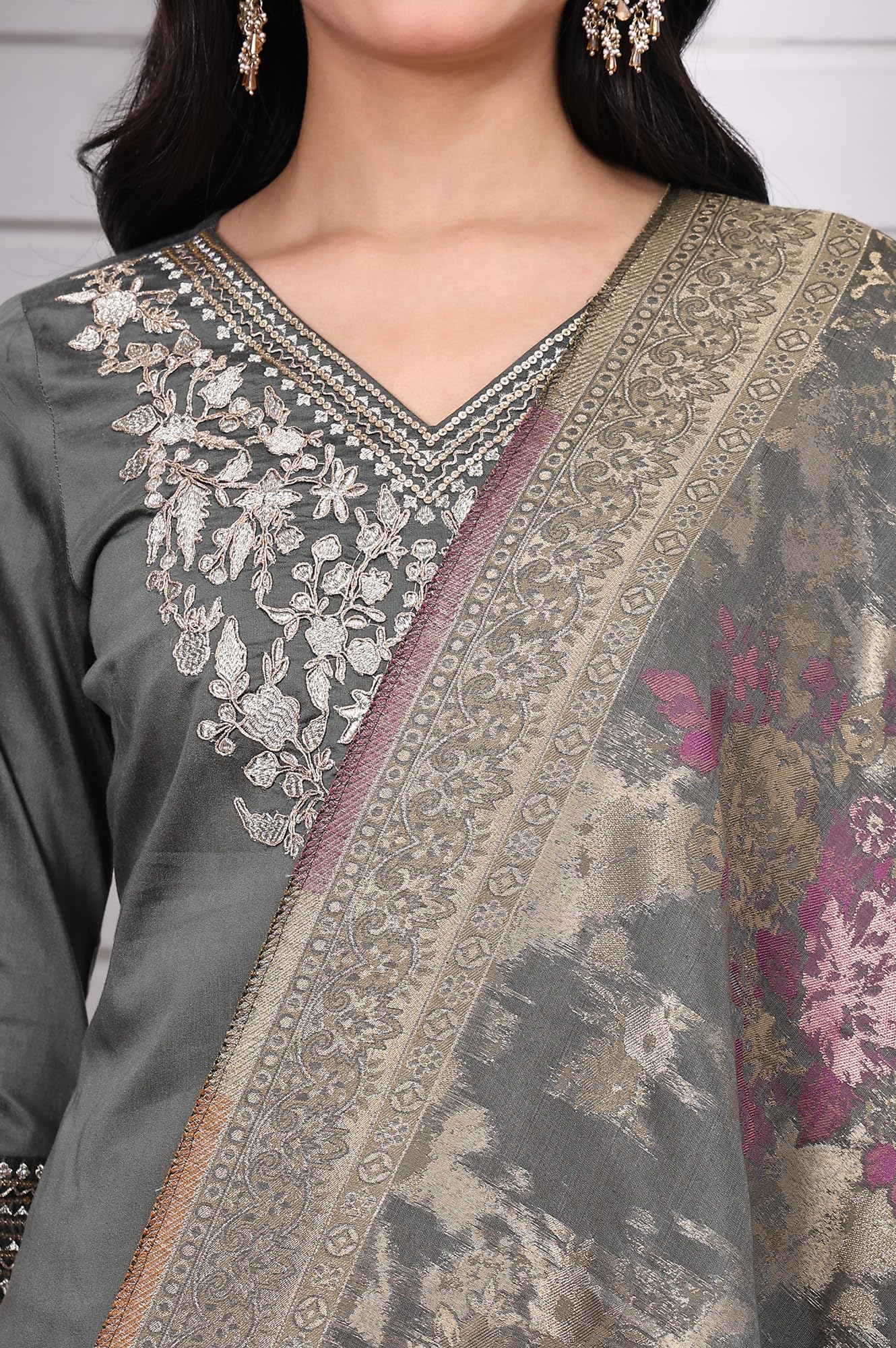 Aurelia Women’s Green Zari Embroidered Rayon Straight Kurta, Palazzo and Dupatta Set (Size: L)-AS16027-705836