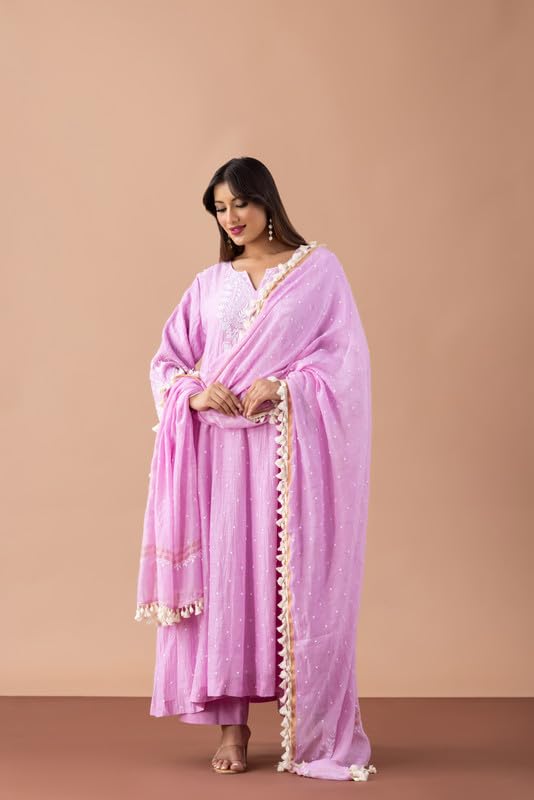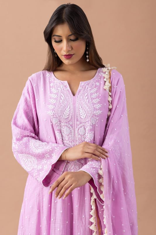 Fibreworld Adah MUL Chanderi Floral Embroidered Anarkali Kurta Set for Women | Kurta & Dupatta – MUL Chanderi, Bottom- Cotton Satin | Relaxed Fit for Women | Lavender, XL
