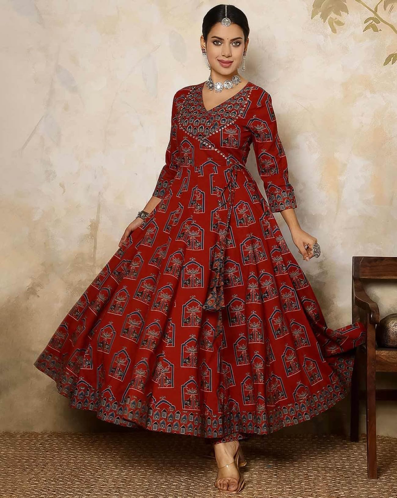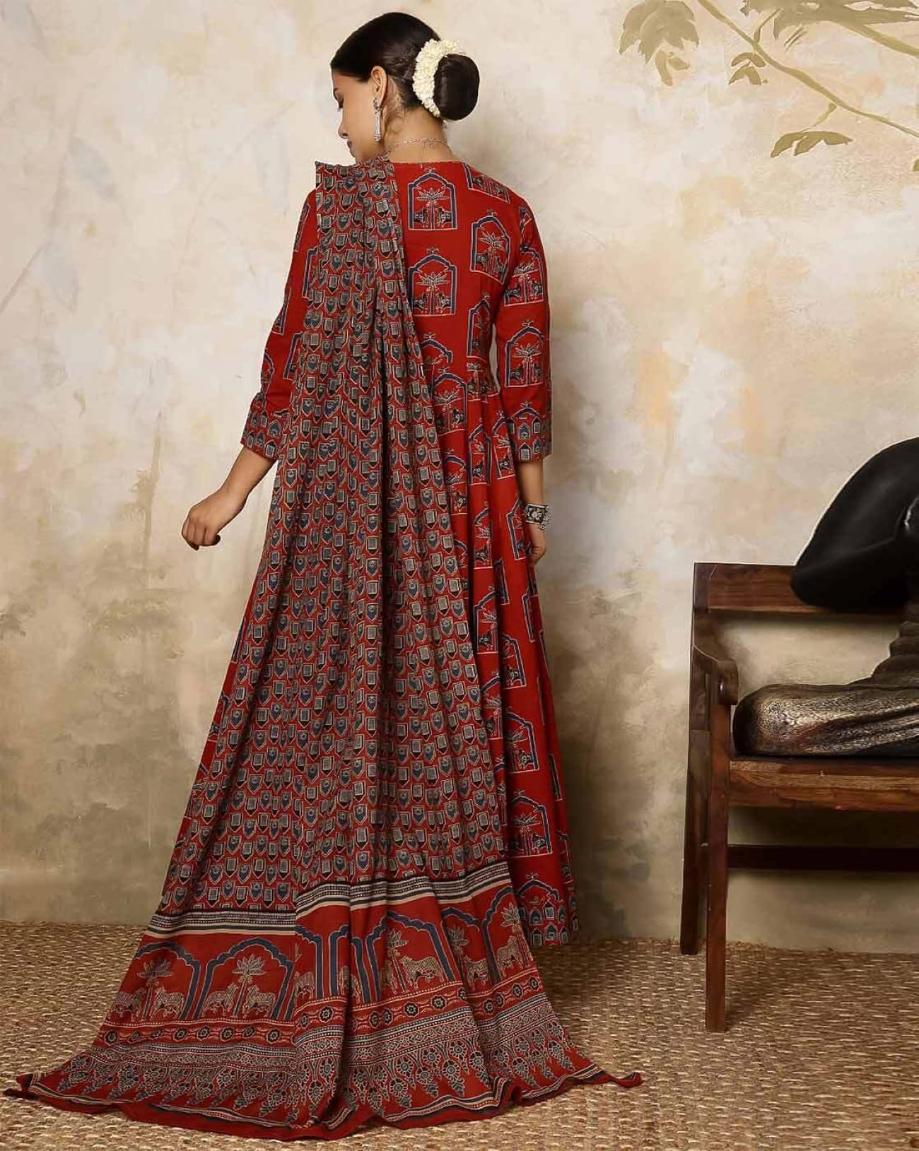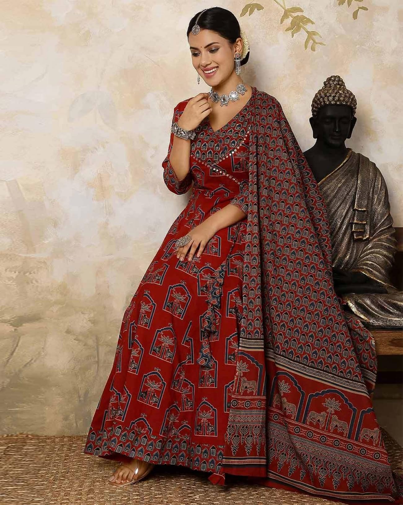 GEKHA|Women’s Red Cotton Printed Flared Kurta with Cotton Pant and Cotton Printed Dupatta Sets | Ethnic Set | Dupatta Set | Suit Set | Kurta Set | Wedding Suit Set | (GEKHA-1036-Red-4XL)