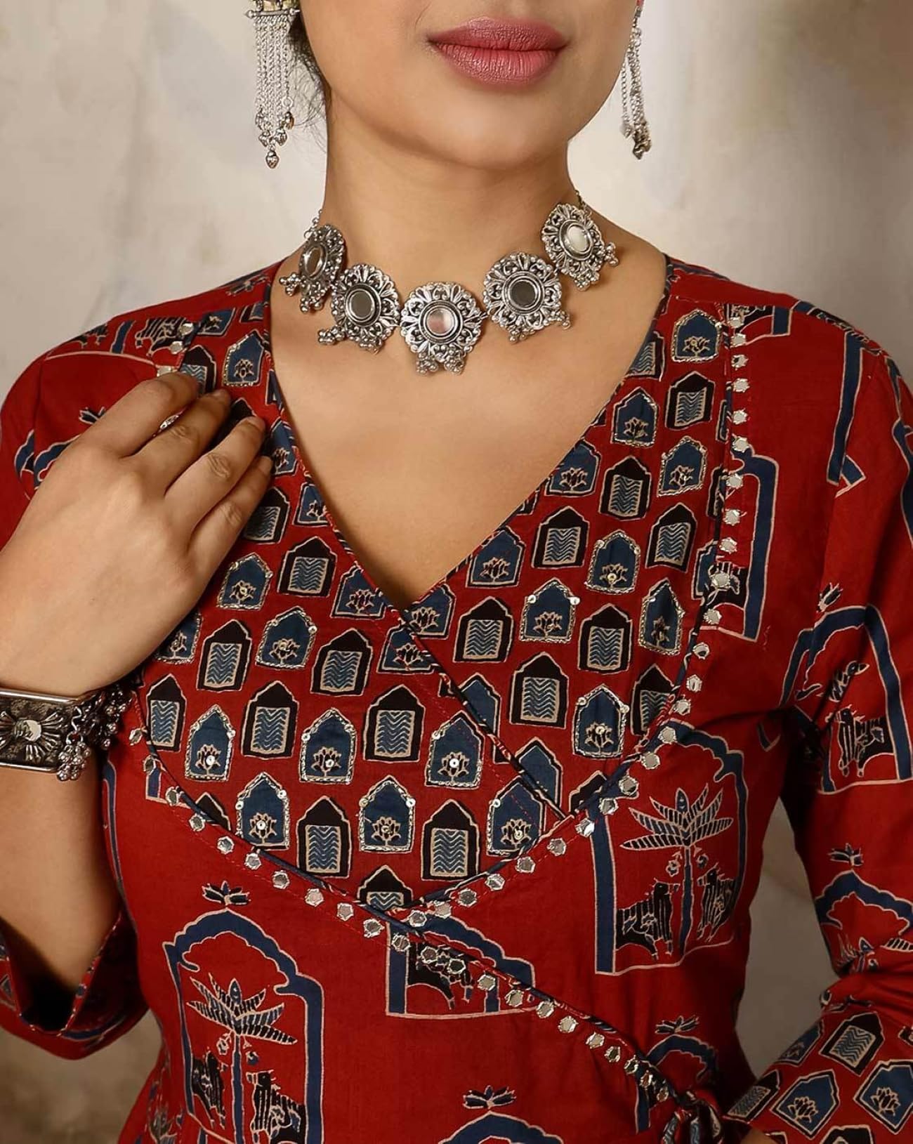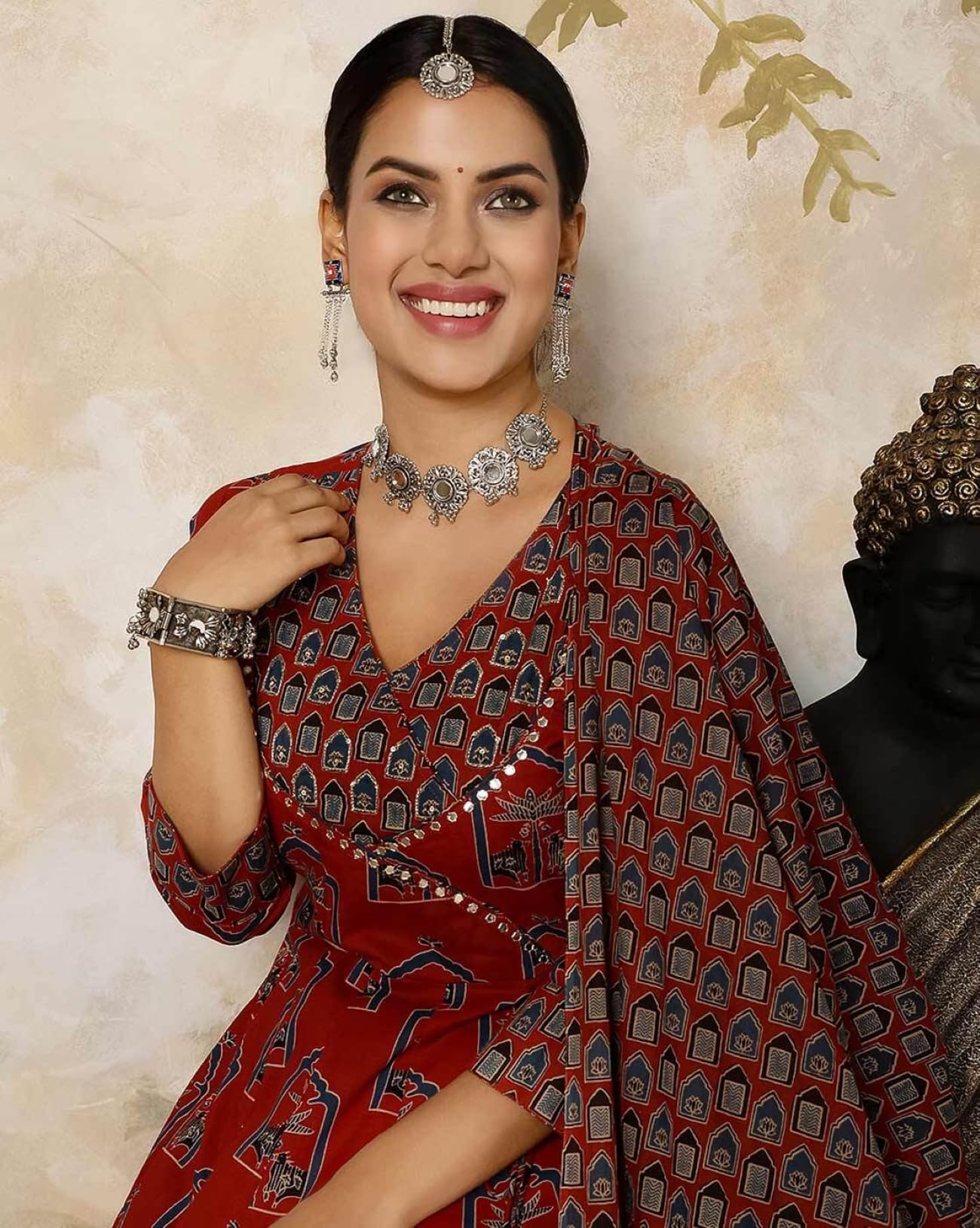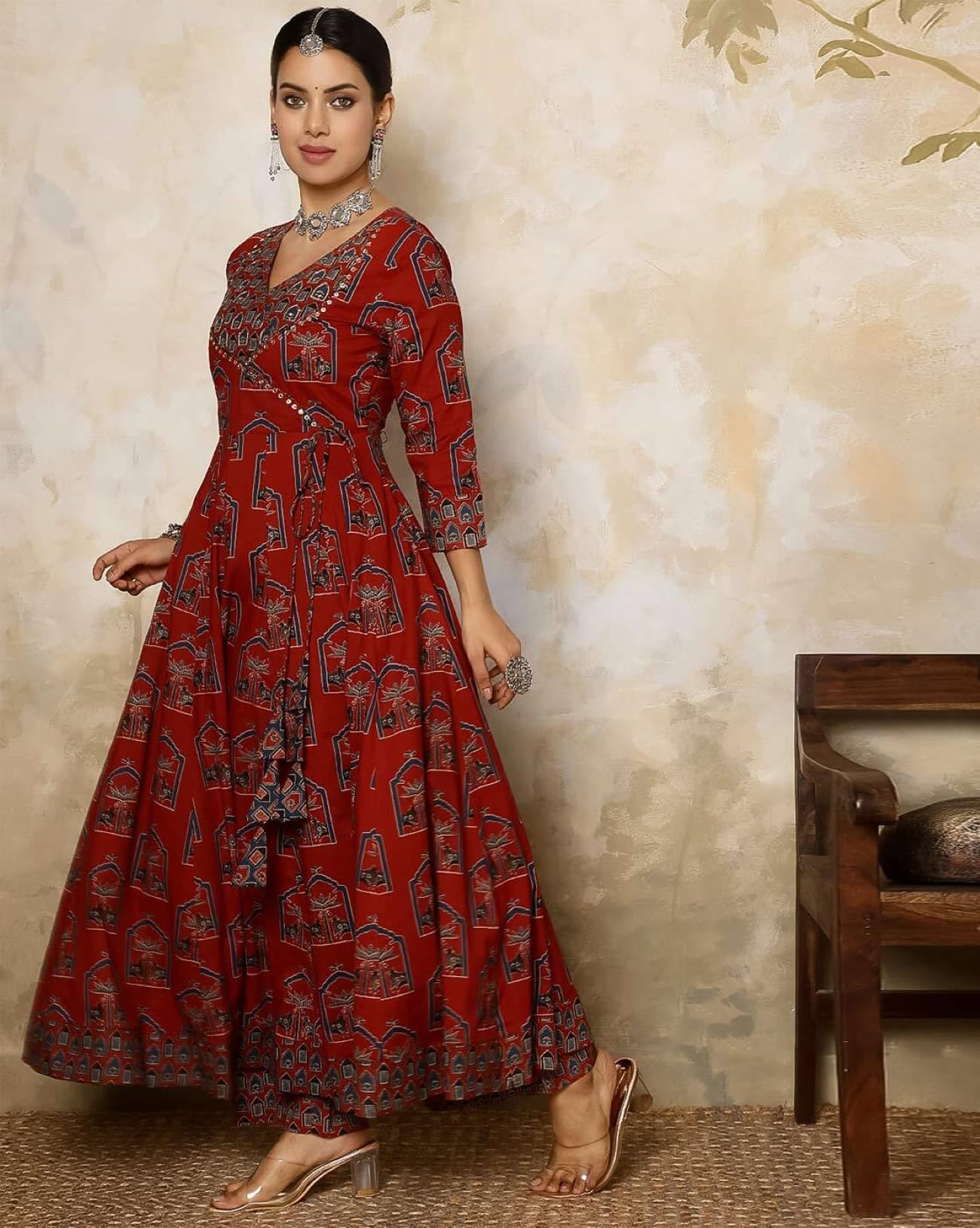 GEKHA|Women’s Red Cotton Printed Flared Kurta with Cotton Pant and Cotton Printed Dupatta Sets | Ethnic Set | Dupatta Set | Suit Set | Kurta Set | Wedding Suit Set | (GEKHA-1036-Red-4XL)