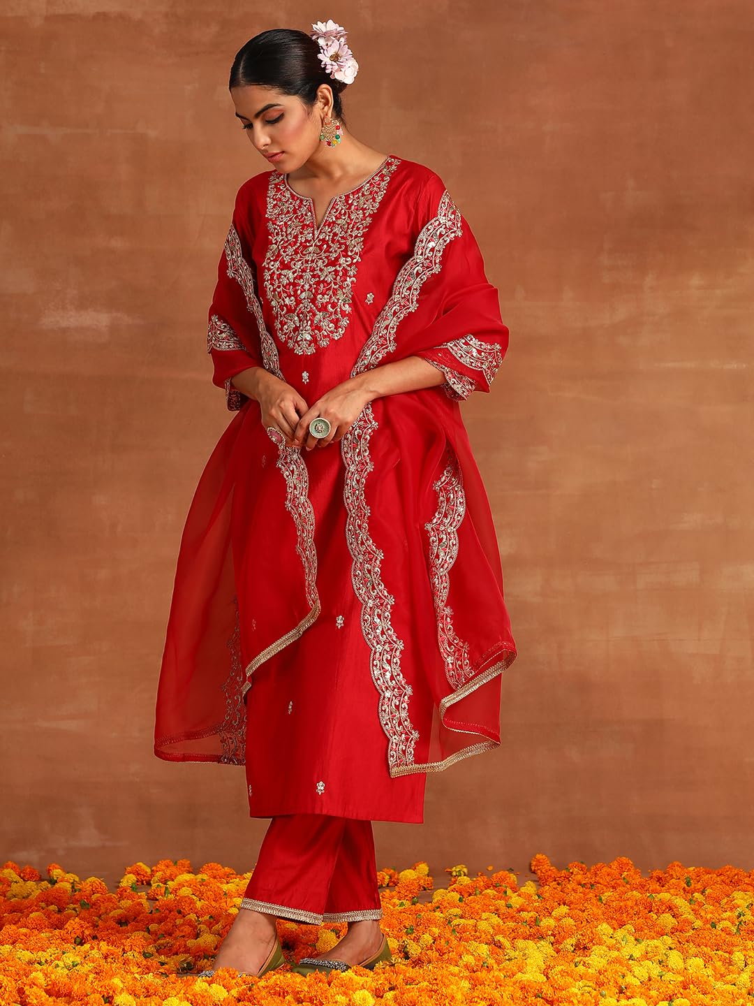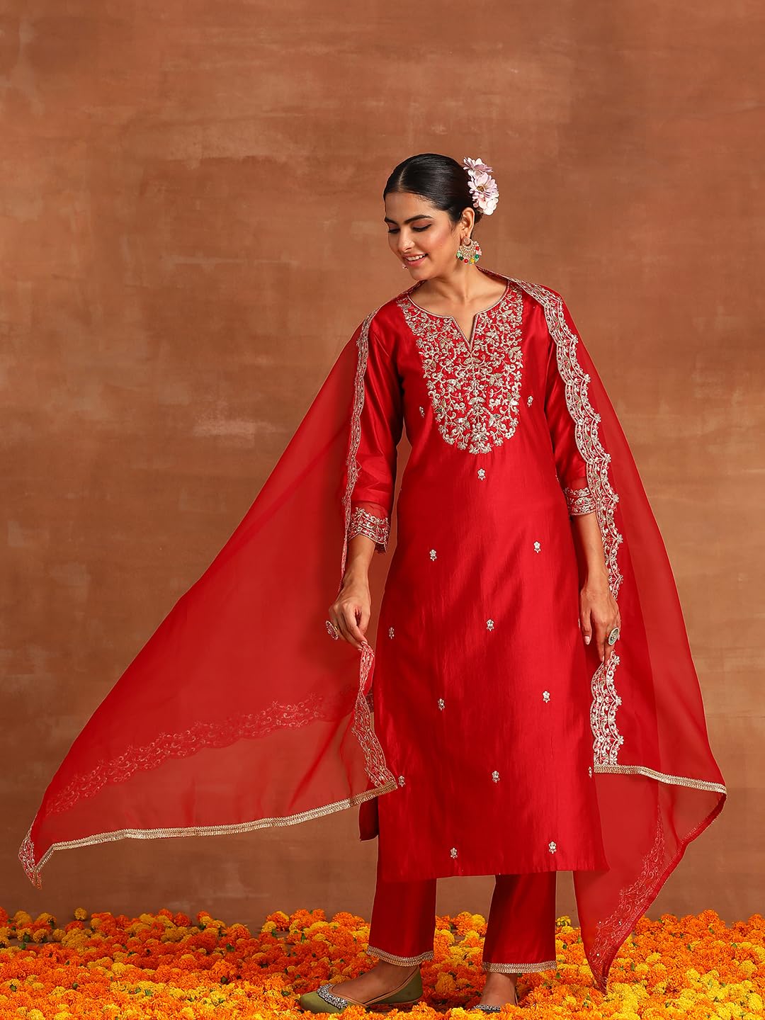 - Color : Red || Top Fabric : Rayon Viscose || Dupatta Fabric : Organza