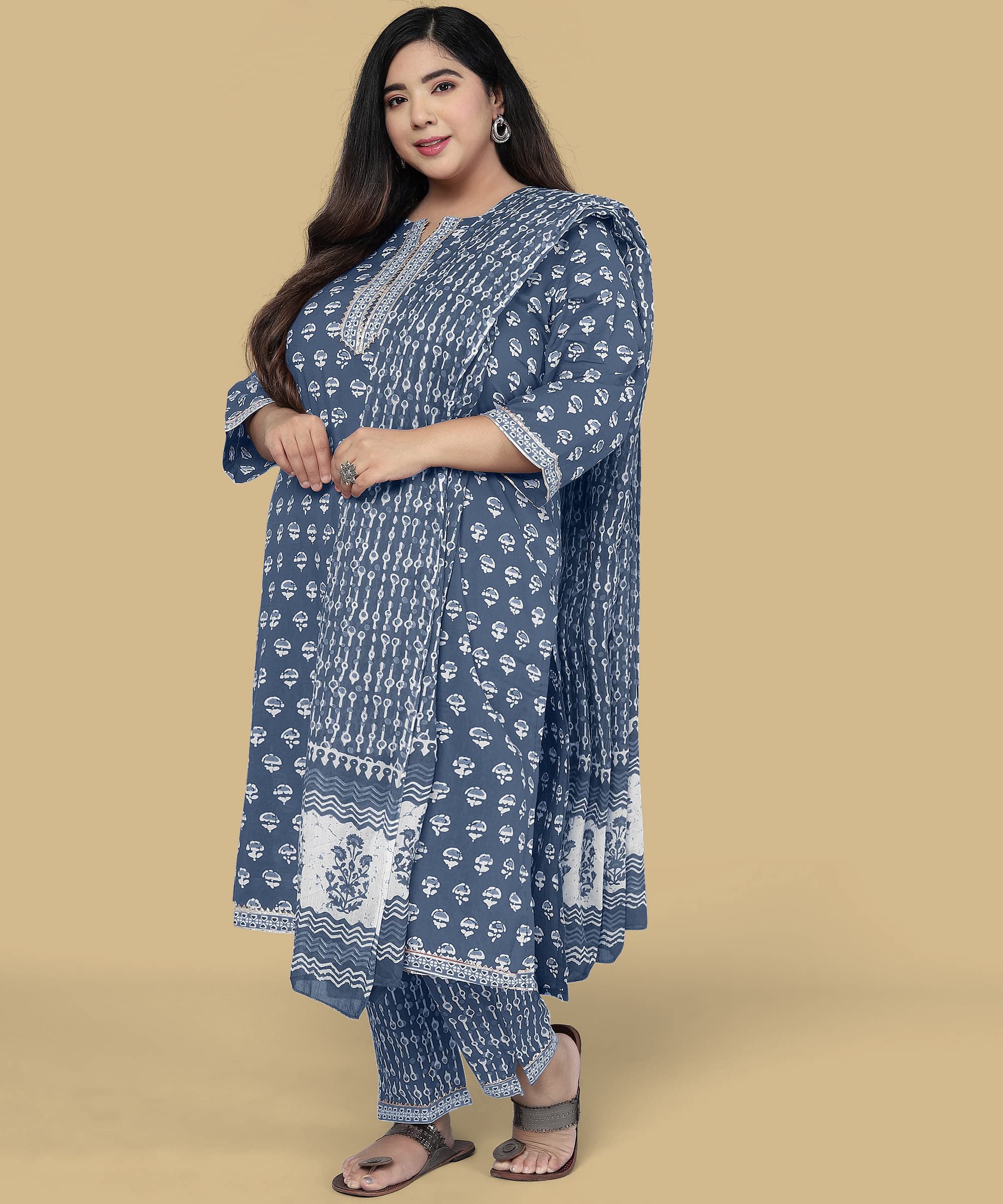 Get a charming traditional look with this beautiful ethnic Kurta Set with Dupatta and Trouser made of high-quality fabric Cotton. This Straight Fit top promises it fits good on your body shape, also offering extra 1 inch margin for customize need and leg movement for all day comfort.