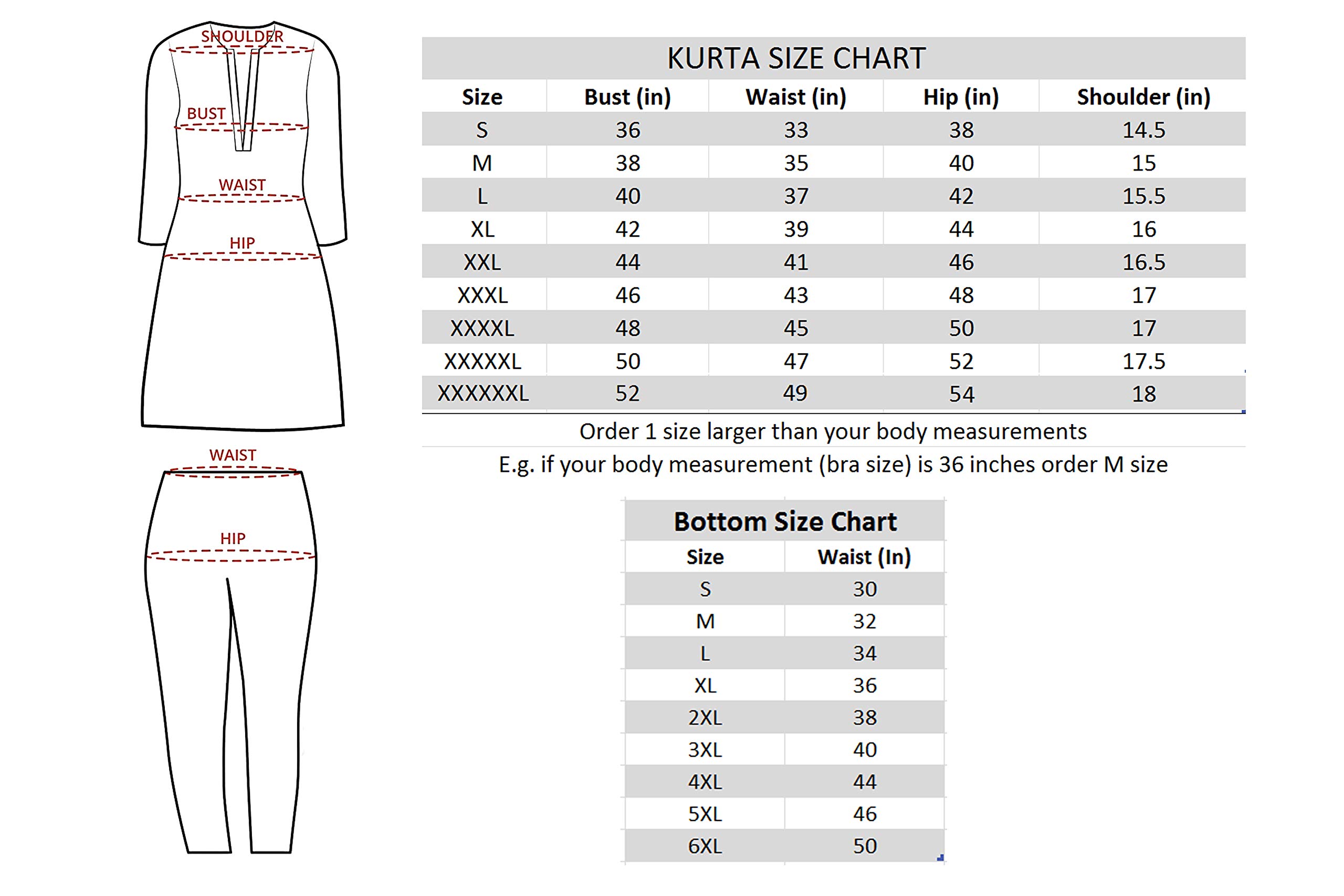 A2. Length may vary due to your body height. Kurta is Calf Length -45 inch. The Model (height 5’8”) is wearing a size ”S”