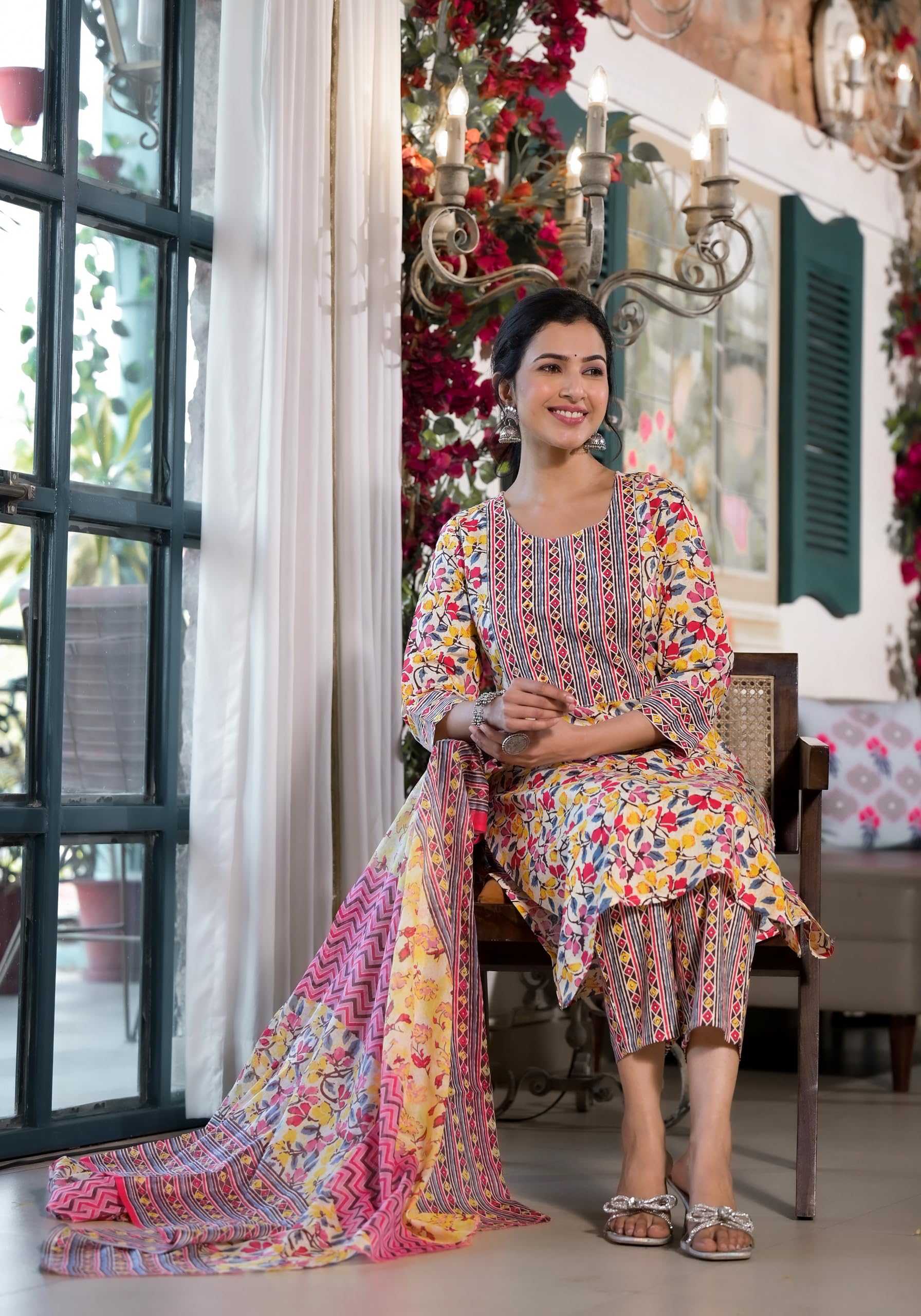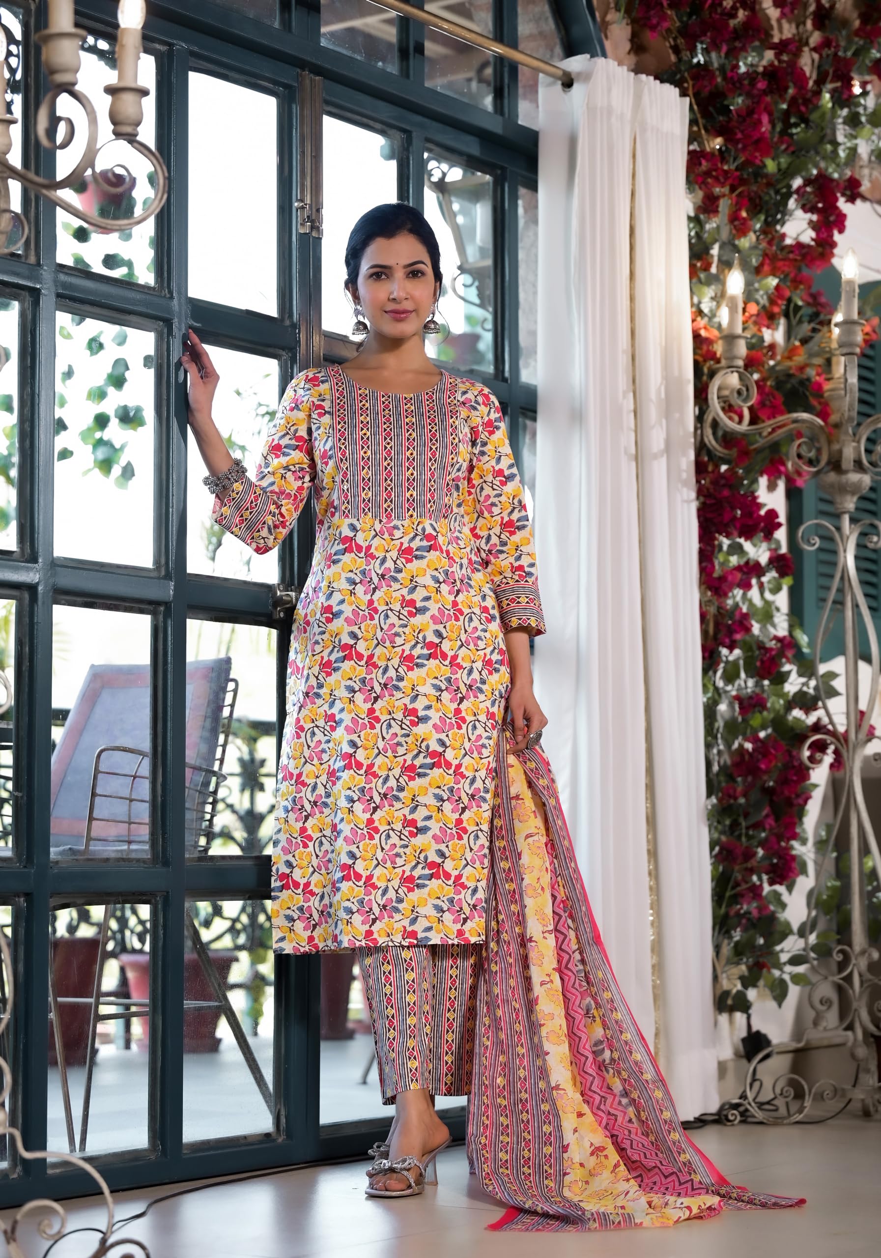 Get a charming traditional look with this beautiful ethnic Kurta Set with Dupatta and Trouser made of high-quality fabric Pure Cotton. This Straight Fit top promises it fits good on your body shape, also offering extra 1 inch margin for customize need and leg movement for all day comfort.