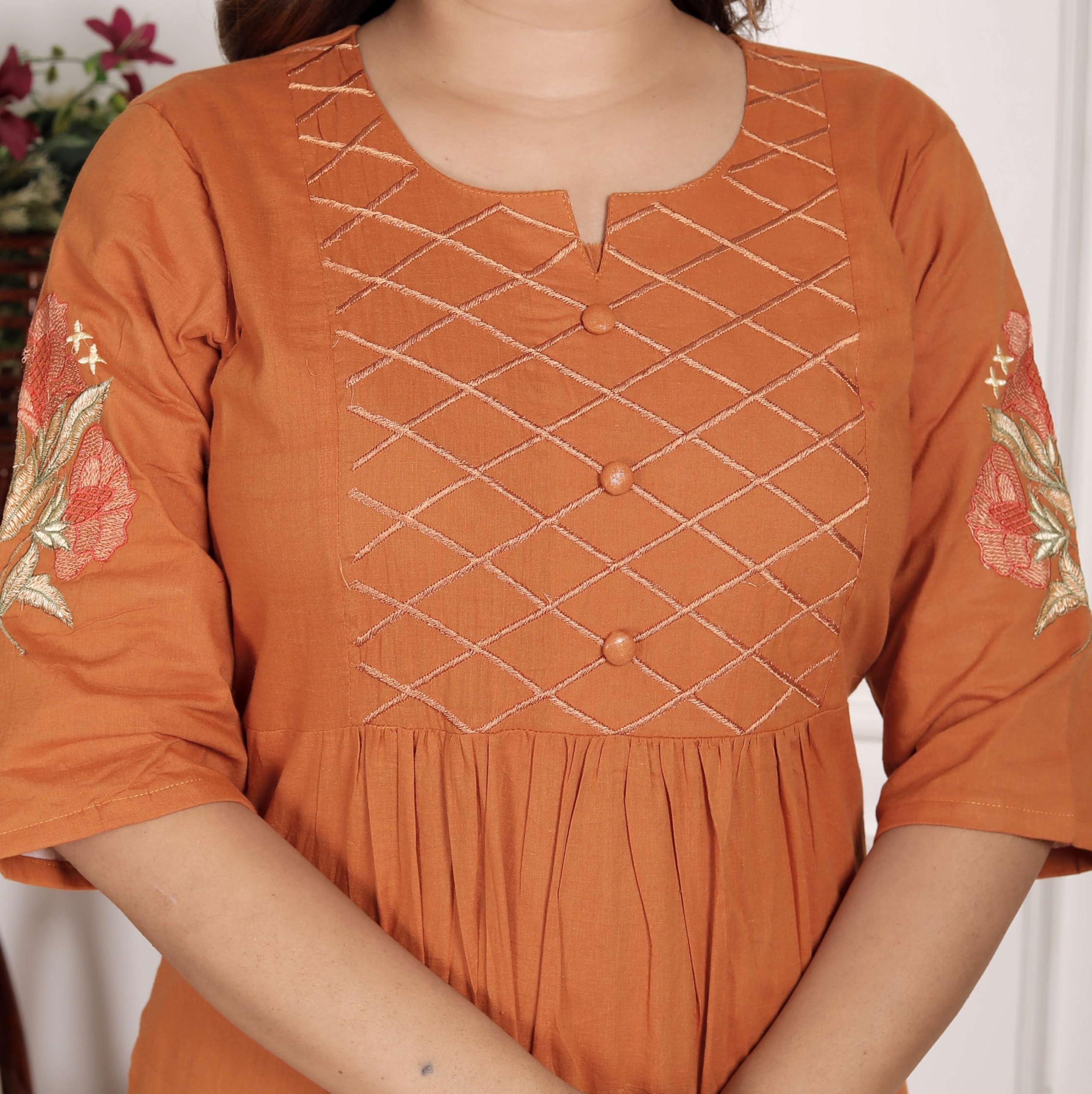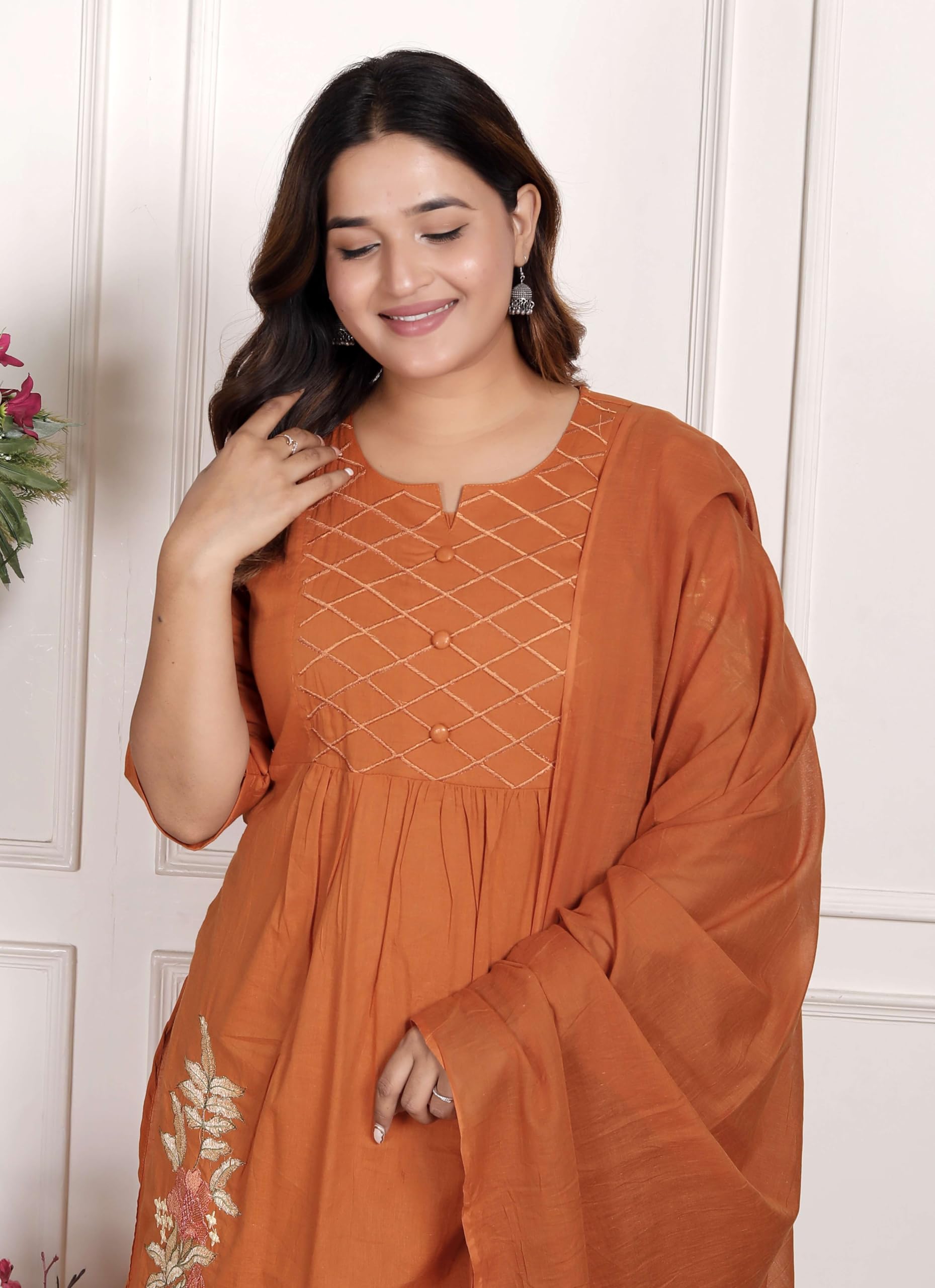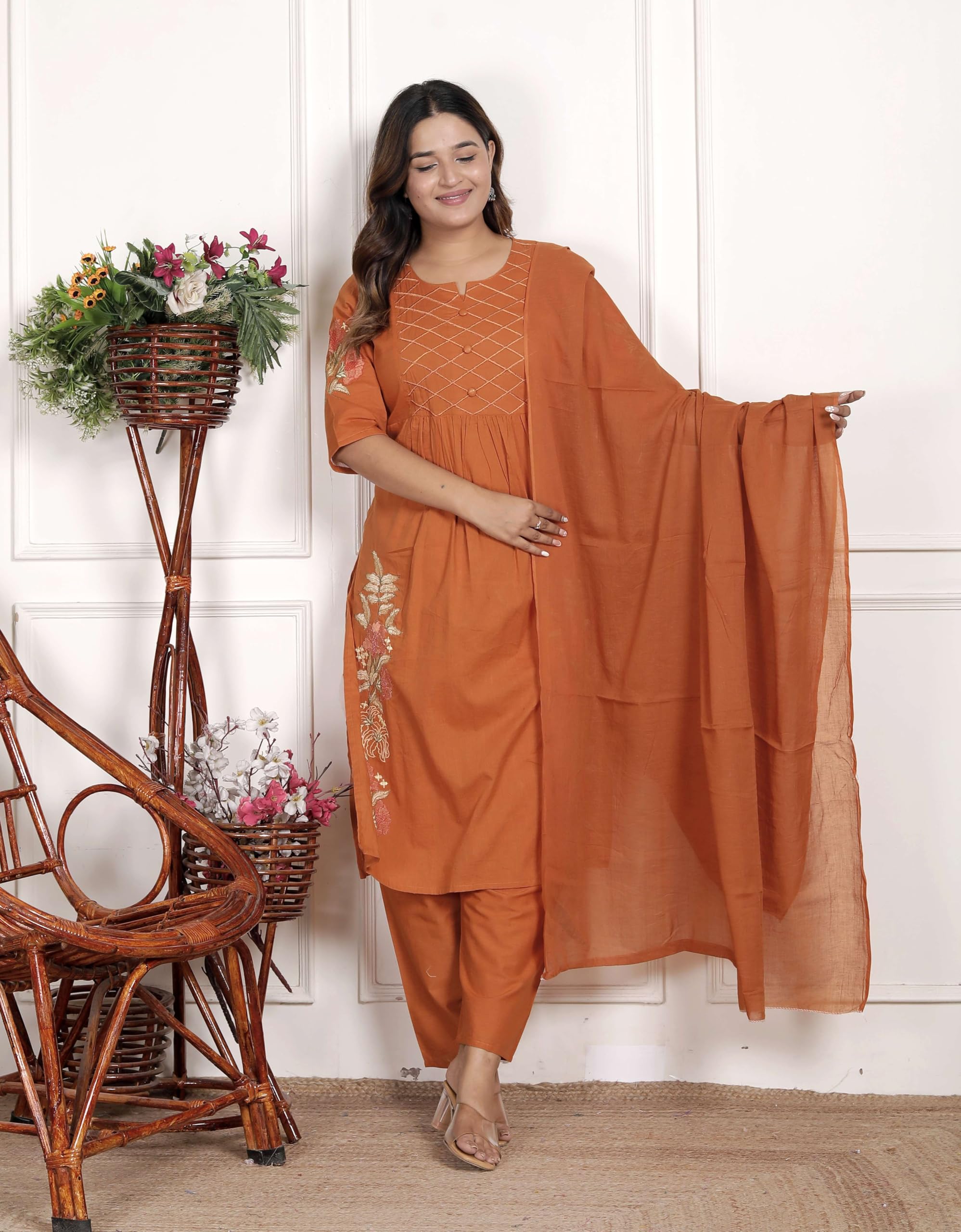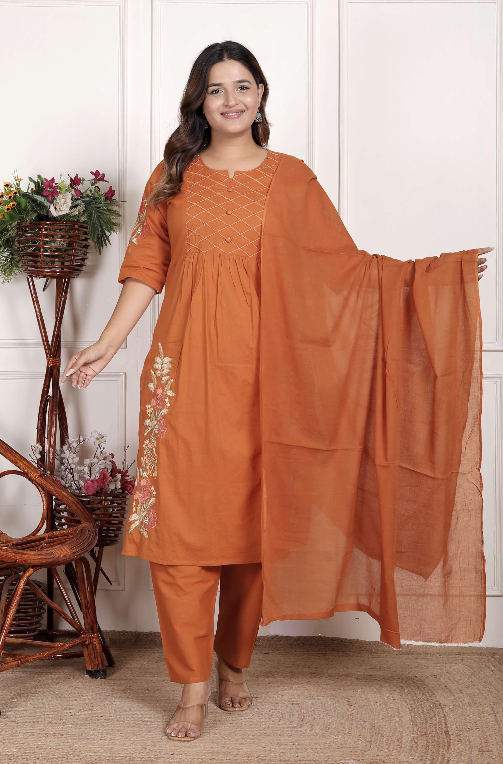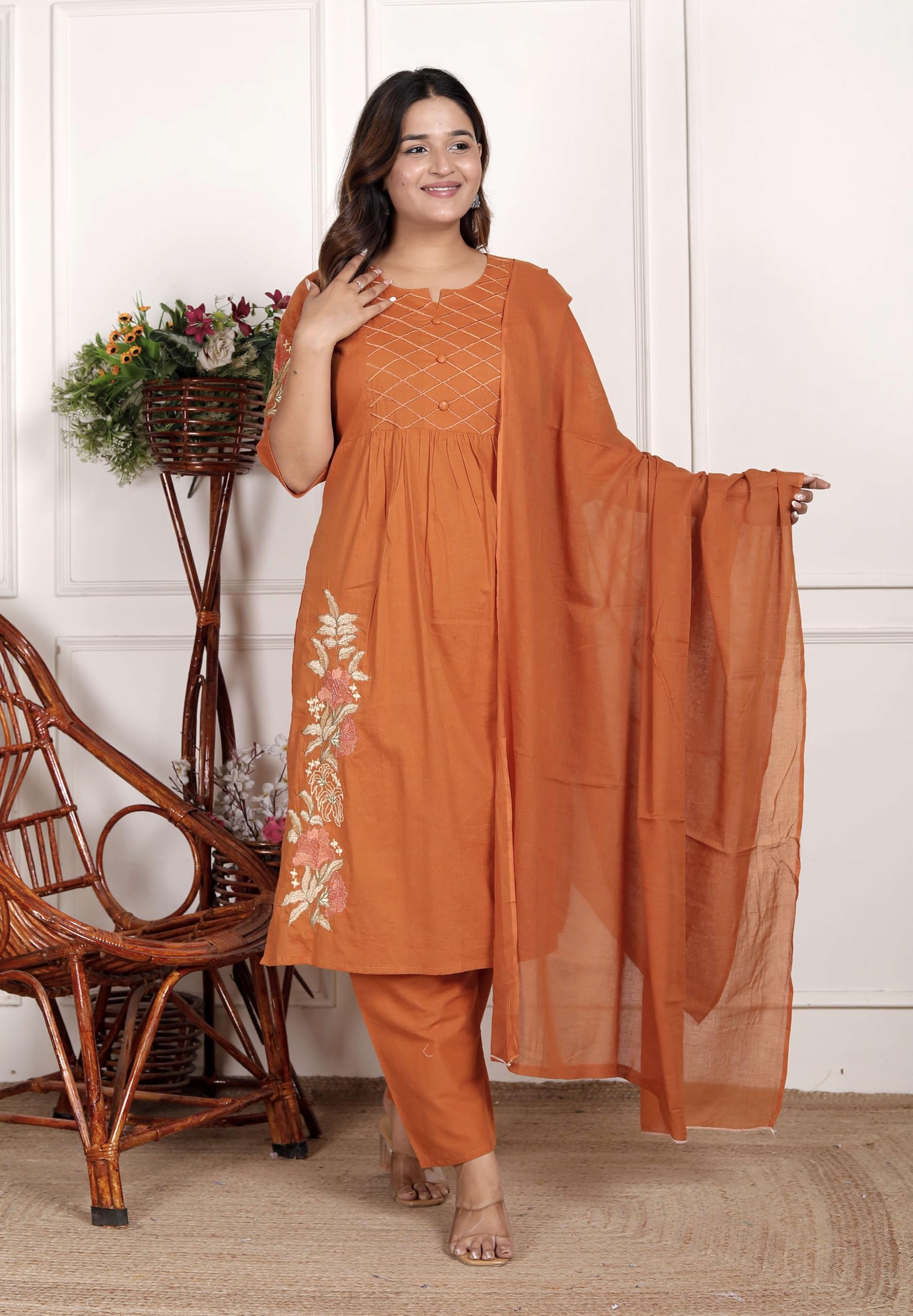 SAWARIYASHYAM Women’s Cotton Printed Straight Kurti with Pant and Dupatta Set (Dark Orange-XL)