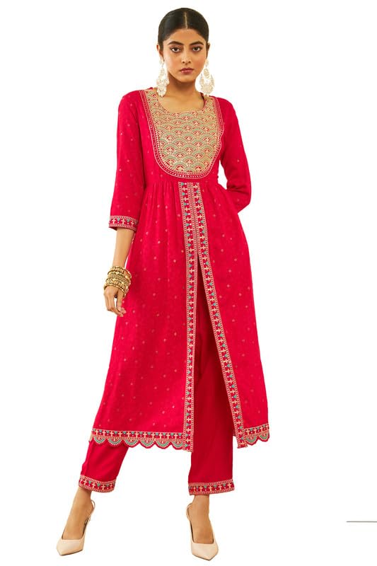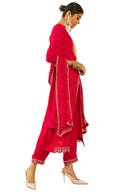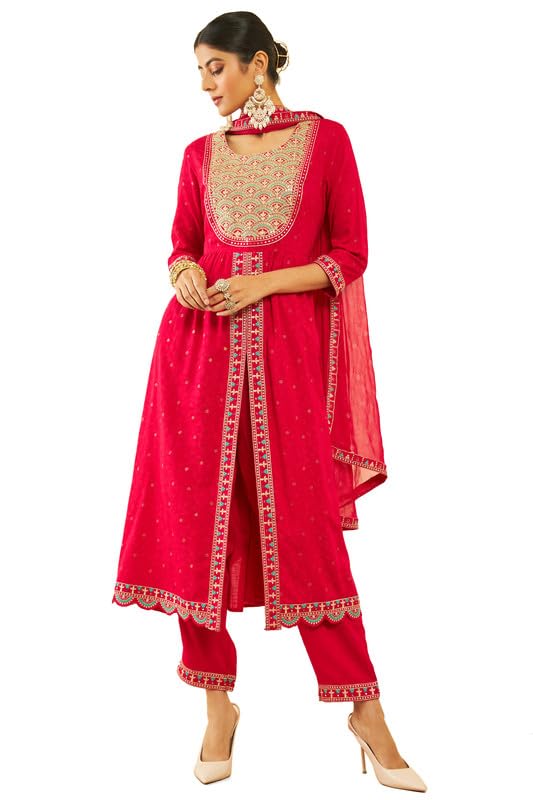 Introducing our Fuchsia Rayon Slub Embroidered Suit Set, featuring a kurta with a scalloped hem and a front slit, adds a touch of elegance to the set. Paired with partially elasticated pants for ease of movement, and complemented by a matching dupatta, this set is perfect for various occasions. Embrace the graceful charm of the scalloped details and embroidery while enjoying the comfort of rayon slub fabric in this versatile and chic suit set.