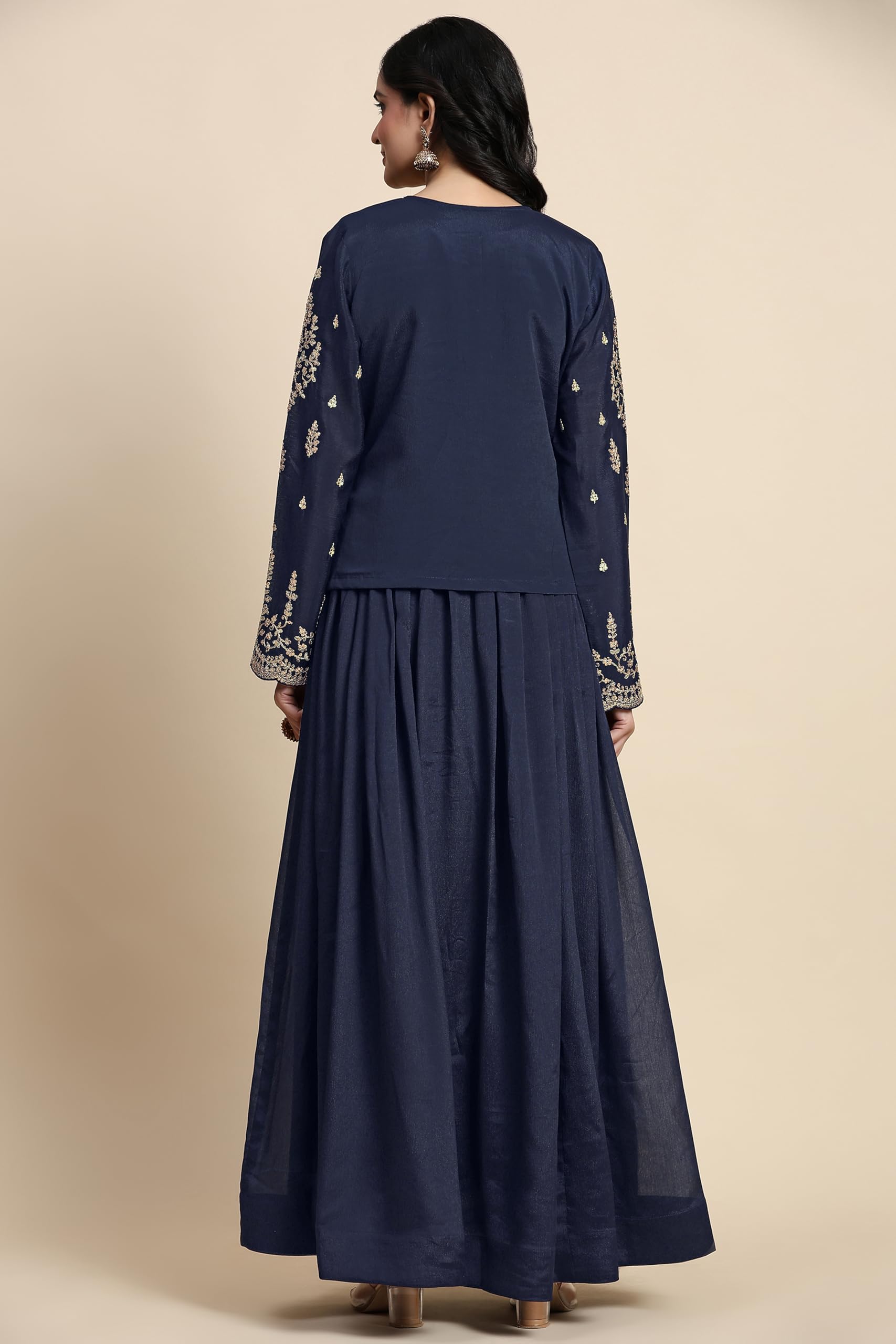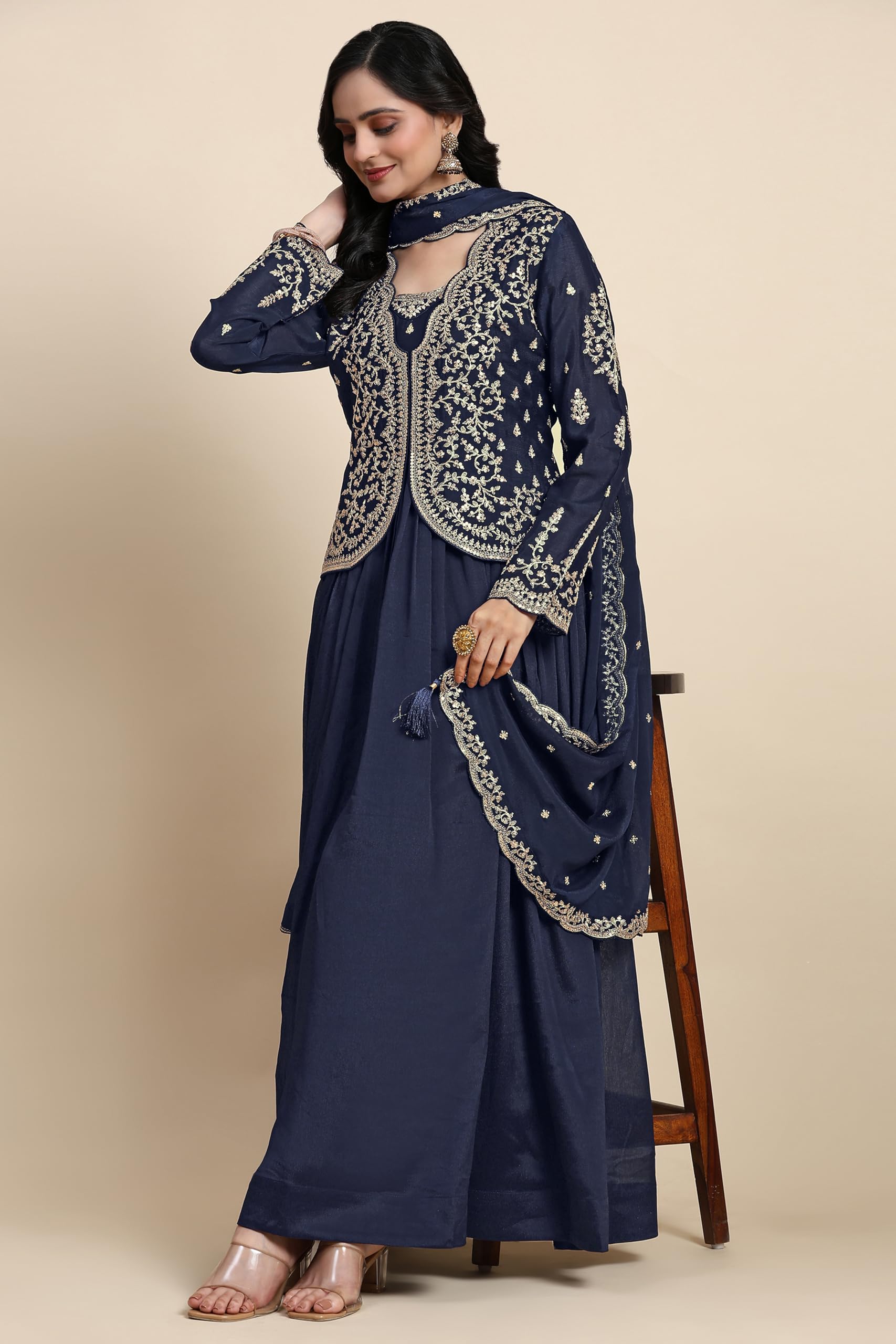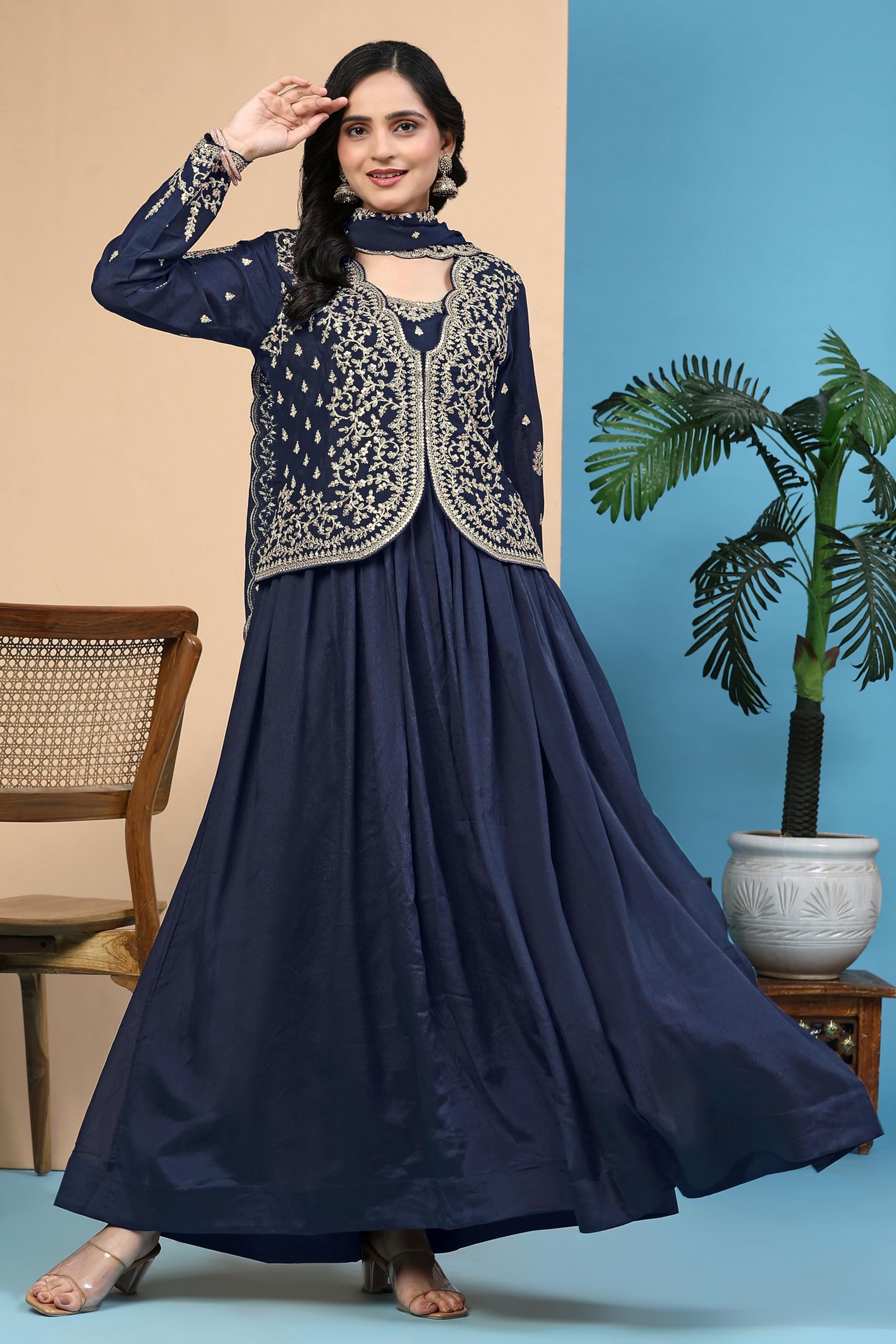TRENDMALLS Women’s Silk Blend Embroidery Shrug Pleated Kurta Pant Set with Dupatta (G250-Blue-XXL)