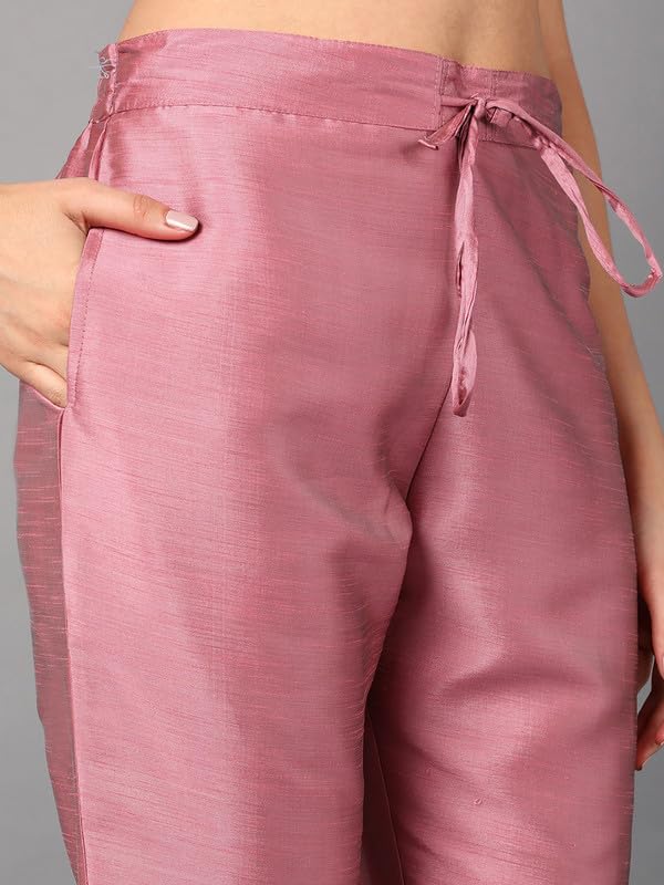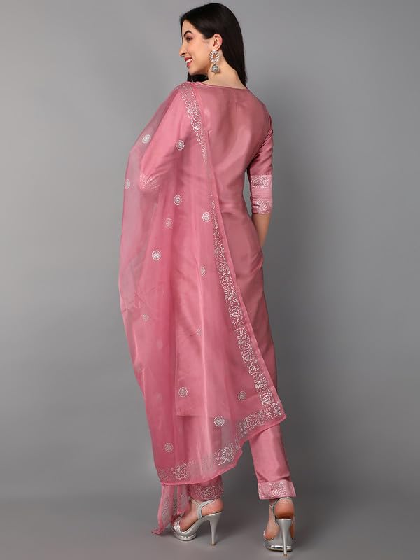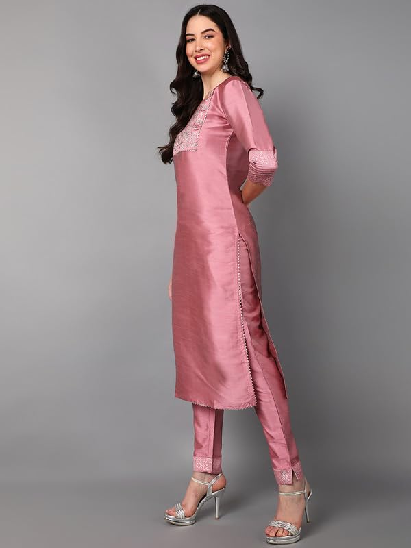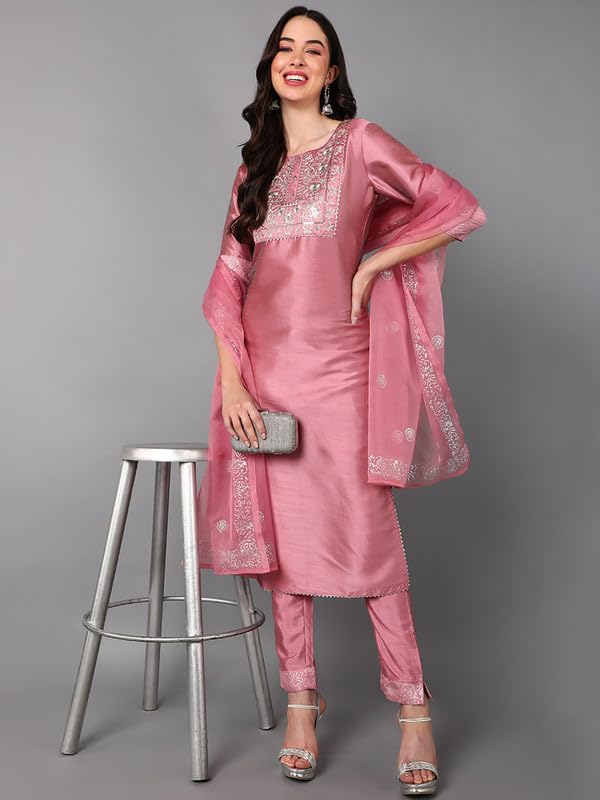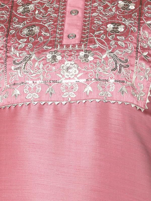 Vaamsi Women’s Silk Blend Yoke Design Embroidered Straight Kurta Pant with Dupatta (PKSKD1432_Pink_XL)