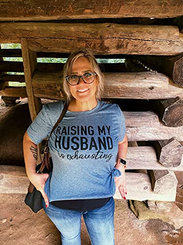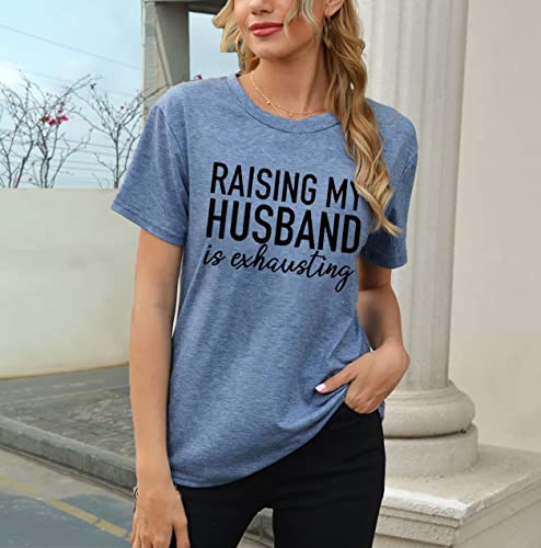 Women Raising My Husband is Exhausting T Shirts Wife Funny Saying Novelty Athletic Shirt Letter Graphic Tee Tops, Blue, XX-Large
