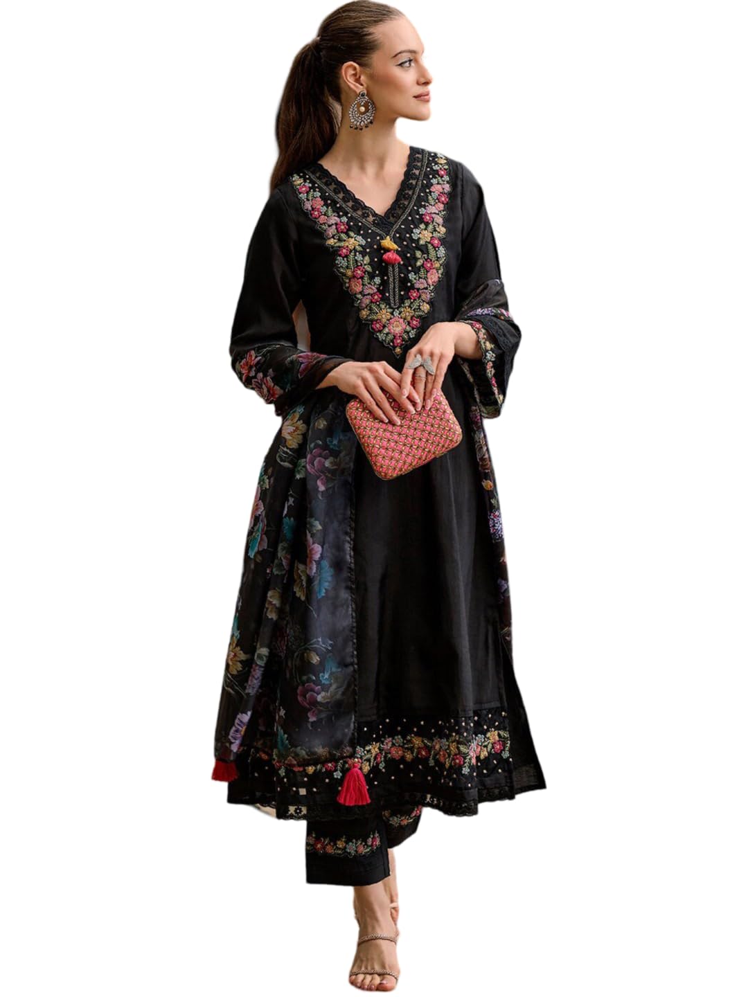 Brand: The Red Lion EnterpriseColor: BlackFeatures: Fabric:- VISCOSE Cotton , Kurta length 45, Pant length 38, Inclusive: Top, Bottom & Dupatta Flattering Size Options: Available in sizes S(36), M(38), L(40), XL(42), XXL(44); designed for a graceful, ready-to-wear fit.Dupatta Fabric : Organza, Floral print with Tessales & Floral Embroidery work on NeckReady to Wear: Fully stitched 3-piece set with a flattering silhouette and easy-to-style comfort for weddings, festivals, and partiesFeatures 3/4th sleeves and a round neckline, adorned with stunning thread and sequin embroidery work.Easy Care Instructions: Machine washable or hand washable for effortless care and lasting beautyExquisite heavy suit set adorned with intricate hand embroidery and elegant Zari weavingLuxurious high-quality fabric with impeccable finishing.Includes: Top, Bottom, and Dupatta (3-piece set).Package Dimensions:...