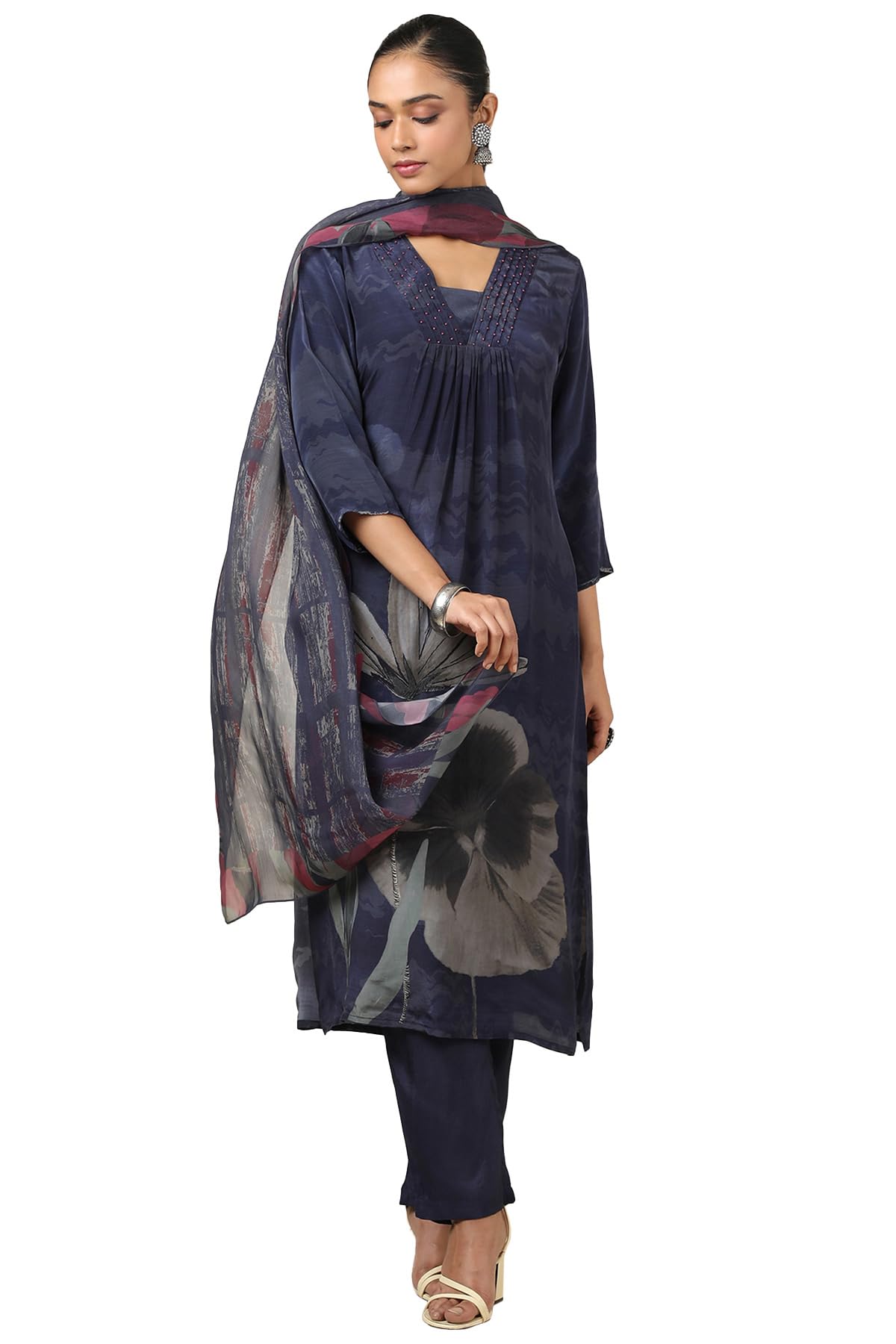 Brand: SochColor: Navy BlueFeatures: Pattern: BotanicalFabric: CrepeEmbellishment Type:BeadsPackage Contains: 1 Kurta, 1 Pant, 1 DupattaPackage Dimensions: 30x300x300Details: Description Soch Womens Navy Blue Crepe Botanical Chudidar Set With Beads