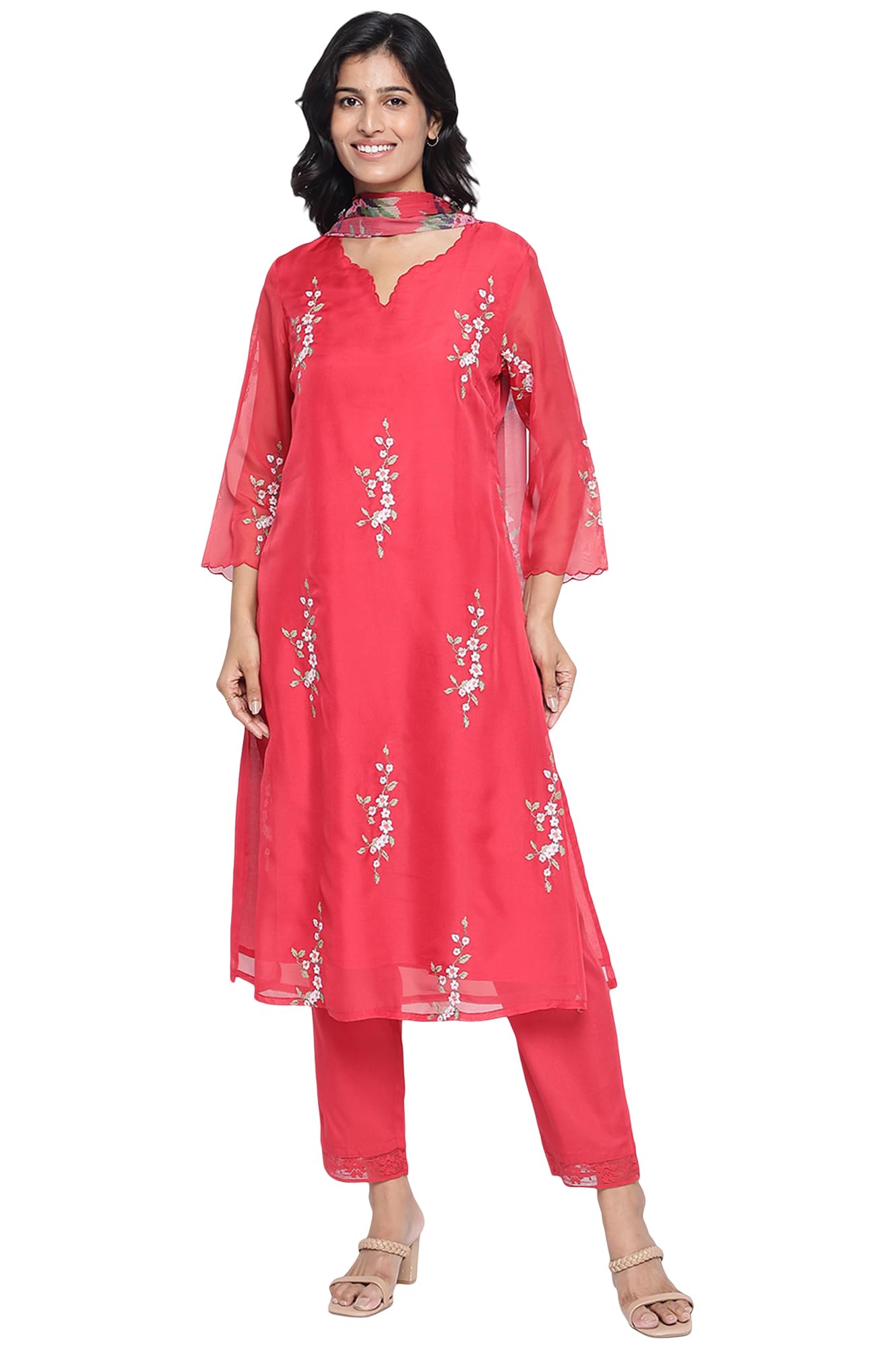 Brand: W for WomanColor: RedEdition: Fusion WearFeatures: Red Embroidered Printed Organza Straight Kurta, Straight Pant and Dupatta SetFabric: OrganzaWash: Hand washPattern: EmbroideredPackage Dimensions: 20x350x462Details: Description Radiate festive elegance in this red organza kurta set featuring intricate embroidery and delicate prints. The straight kurta is paired with tailored pants and a soft dupatta, making it perfect for formal gatherings and celebrations. The sheer organza lends an ethereal charm while the embroidery adds richness to the look. This kurta set for women is designed to offer sophistication with a hint of glamour, making it a standout choice for weddings or poojas. Lightweight yet festive, it blends tradition with elegance.