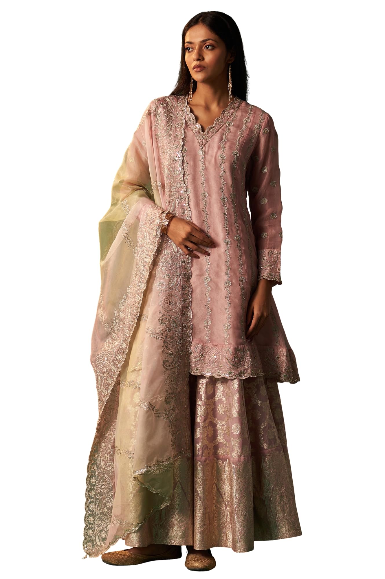Brand: WishfulColor: LilacFeatures: Style this lilac kurta set with metallic heels and statement earrings for a festive look. Add a pastel clutch to complement the intricate embroidery and complete your ensemble.Package Dimensions: 20x330x396