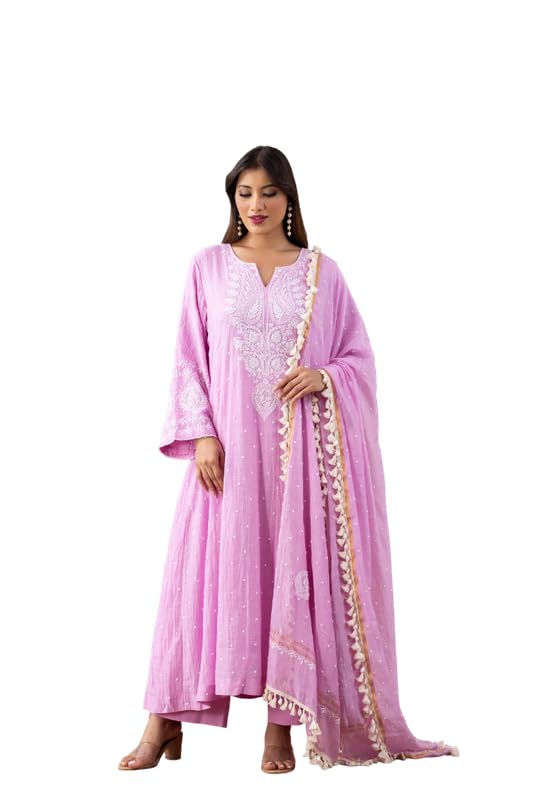 Brand: FibreworldColor: LavanderFeatures: Fabrics: The Mul Chanderi kurta is lightweight and breathable, while the cotton satin bottom ensures comfort, and the chiffon dupatta adds grace with its airy texture.Floral Embroidery: The kurta is adorned with intricate floral embroidery, adding a sophisticated and artistic touch to the outfit.3-Piece Festive Ensemble: Includes a Mul Chanderi kurta, chiffon dupatta, and cotton satin bottom, offering a complete and elegant look for various occasions.Relaxed Fit: Designed with a relaxed fit, offering comfort and ease of movement without sacrificing style.Ideal for Special Occasions: Perfect for weddings, festivals, and family gatherings, combining traditional charm with modern comfort.Package Dimensions: 0x0x0