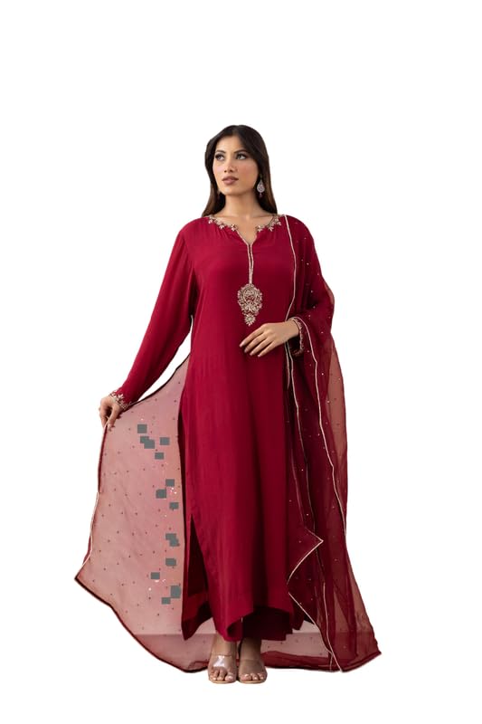 Brand: FibreworldColor: MaroonFeatures: Fabric Combination: Crepe kurta offers a smooth drape, cotton satin bottom provides comfort, and silk organza dupatta adds refined elegance.Rich Maroon Shade: Deep, vibrant color enhances the outfit’s sophistication, making it suitable for festive and formal occasions.Classic Yet Contemporary: Minimalist solid design with luxurious fabrics creates a balance of traditional grace and modern style.Elegant 3-Piece Ensemble: Includes a solid crepe kurta, cotton satin bottom, and silk organza dupatta for a complete ethnic look.Versatile Wear: Ideal for festive gatherings, cultural functions, weddings, or semi-formal events, easily styled with jewelry and accessories.Package Dimensions: 0x0x0